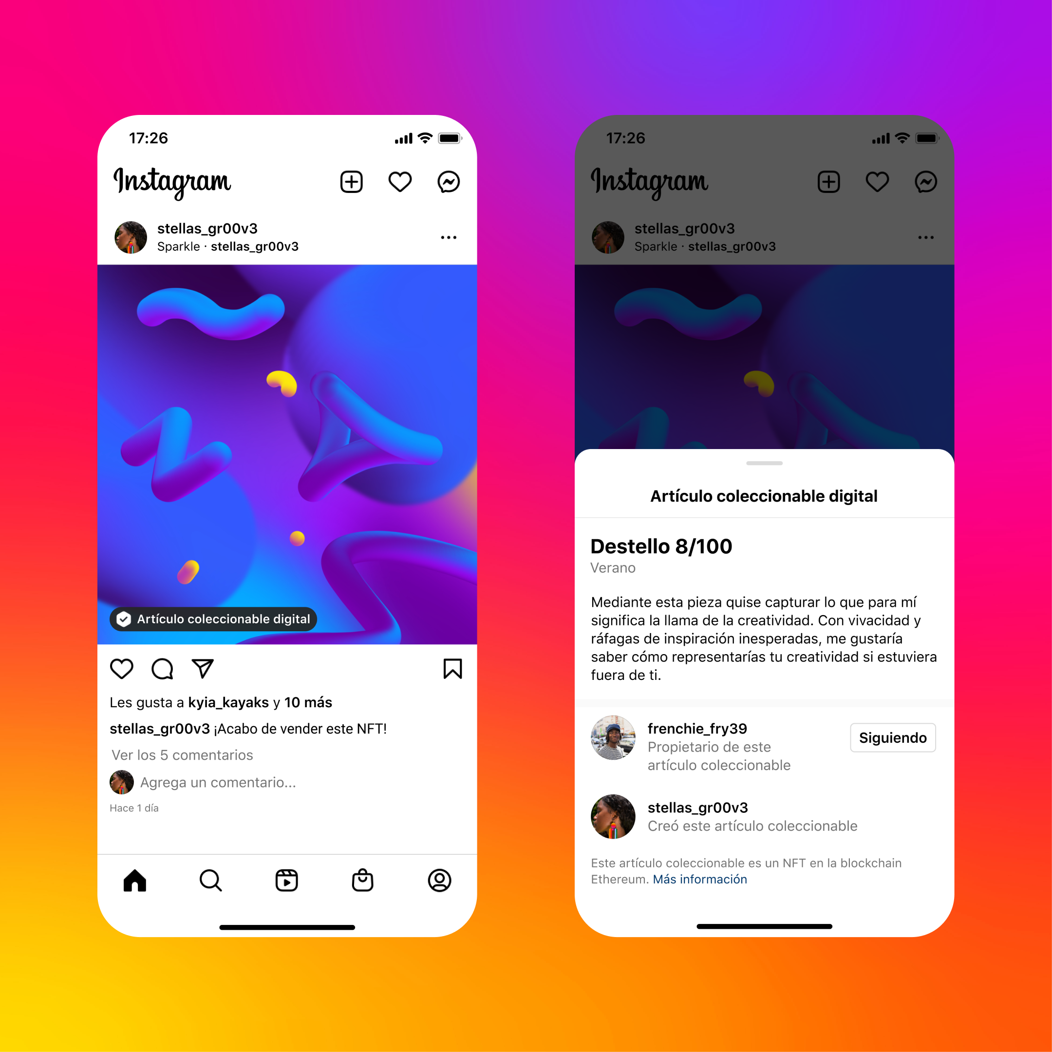 Cada día, los creadores inspiran a las personas e impulsan la cultura en todos los rincones del mundo. Gracias a la increíble oportunidad que nos ofrece la tecnología blockchain, ahora podemos utilizar nuevas herramientas para generar ingresos, y los fans pueden apoyar a sus creadores favoritos comprando artículos coleccionables digitales (arte, imágenes y videos, música o tarjetas intercambiables) como tokens no fungibles (NFT). Y ya casi a mediados del mes de mayo ciertos creadores y coleccionistas ya comenzaron a compartir sus artículos coleccionables digitales en Instagram.