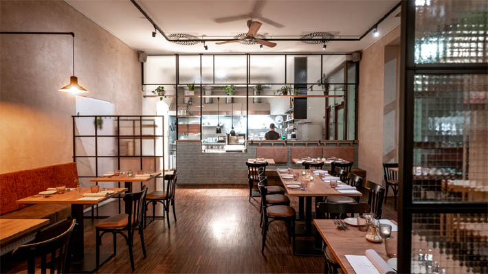 La ambientación del restaurante complementa la experiencia gastronómica, con amplios ventanales, una decoración discreta pero acogedora y mesas de madera que invitan a los comensales a disfrutar de una velada memorable.